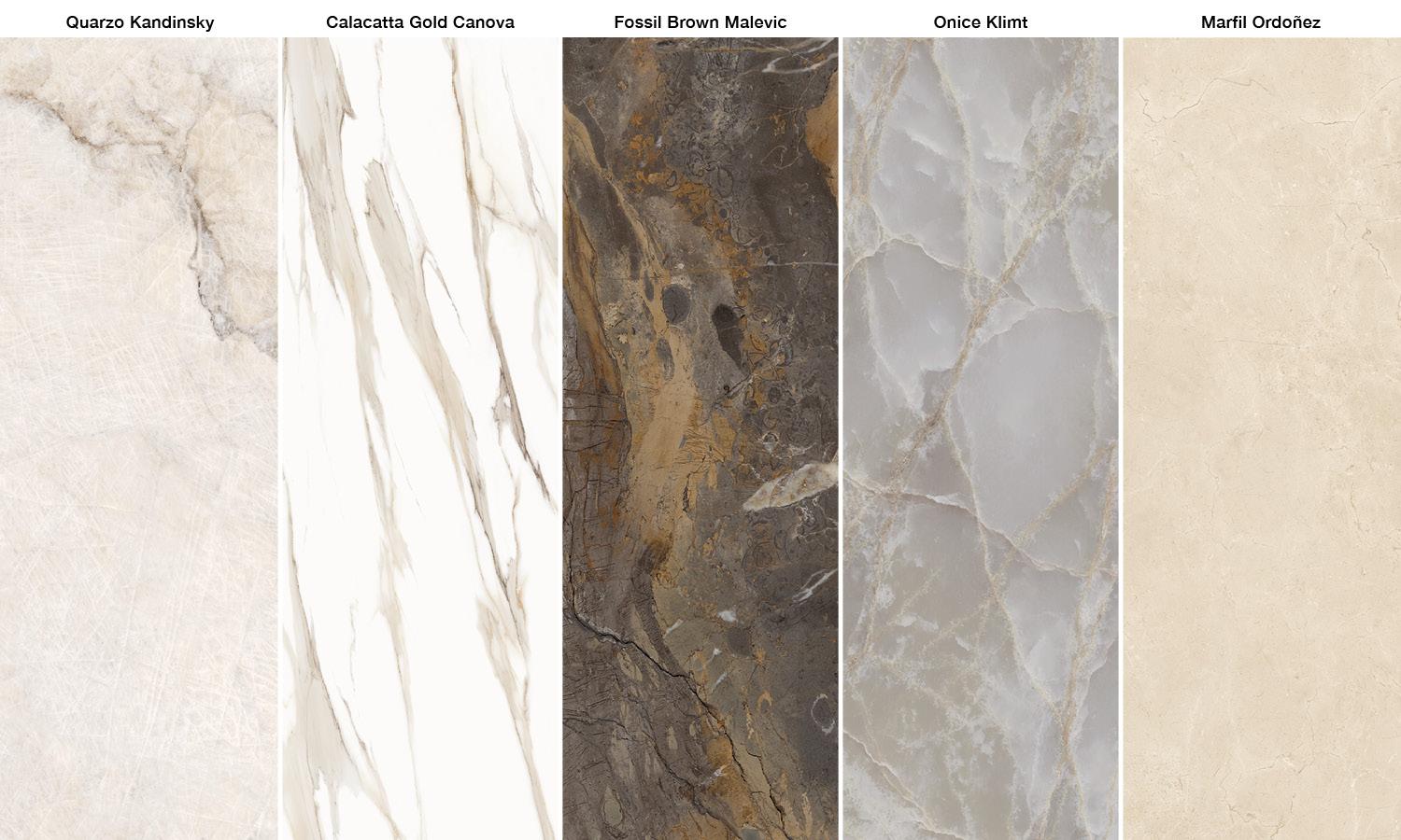The project originated from the idea of reinterpreting marble, a material of timeless charm, in contemporary key through an unconventional choice of sizes, finishes and decorative elements. Five new natural and semi-polished marbles find their highest expression in the large slab sizes, where the vein patterning becomes the absolute star. The flowing lines, colour shades and nuances in step with the different veins make the Tele di Marmo Reloaded fully-fledged works of art.