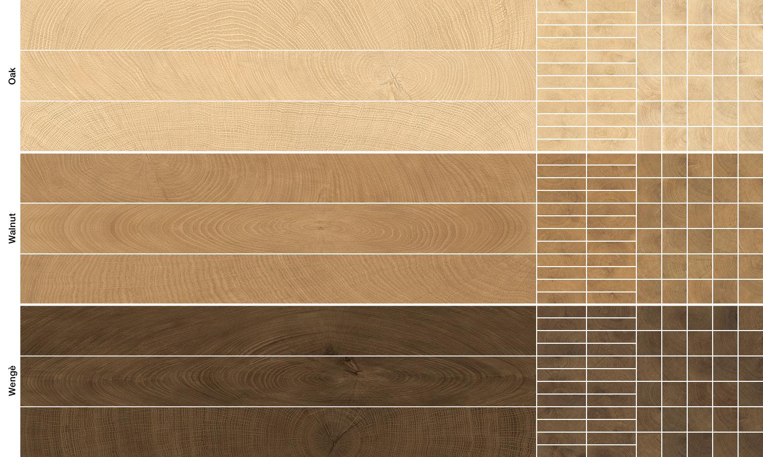 The unique signature of the trees, sculpted by Italian hands in timeless forms. The “W-Circles” collection isn’t just about reproducing the wooden matter but exploring the broader topic of its rings: symbols of perpetual growth, labyrinths of memories and meaning. Available in three colours, the range includes the 10×10 size, the 5.3×30 brick and the two 10x120 and 20×120 planks, as well as the 60×120 3D Slats decor with slat motif. The product is made by combining two different woods to create an articulated and complex composition in which the balance between the proportions and the visual fluidity is perfectly harmonious. The result is a material in which the cyclicity of the seasons becomes a style detail, transforming every setting into a homage to time and the beauty of nature. The collection is enriched with the Mosaico 5x5 and the Mosaico 3D Cube with wood-look three-dimensional tiles that bring extra dynamism to spaces.