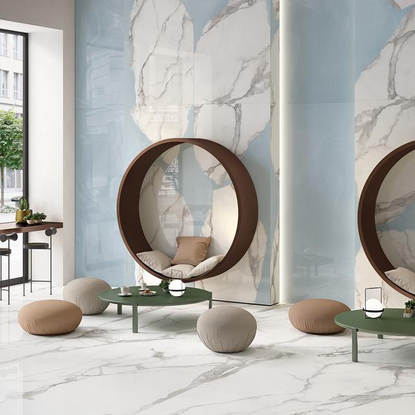 Marble-effect porcelain stoneware tiles are a sophisticated and striking style choice, ideal for adding a dash of refinement to any setting.