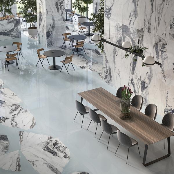 But what is marble-effect porcelain stoneware? Marble-effect porcelain stoneware consists of slabs on which the typical veining, motifs and patterns of marble have been faithfully reproduced to give the impression that it is an authentic natural stone.
