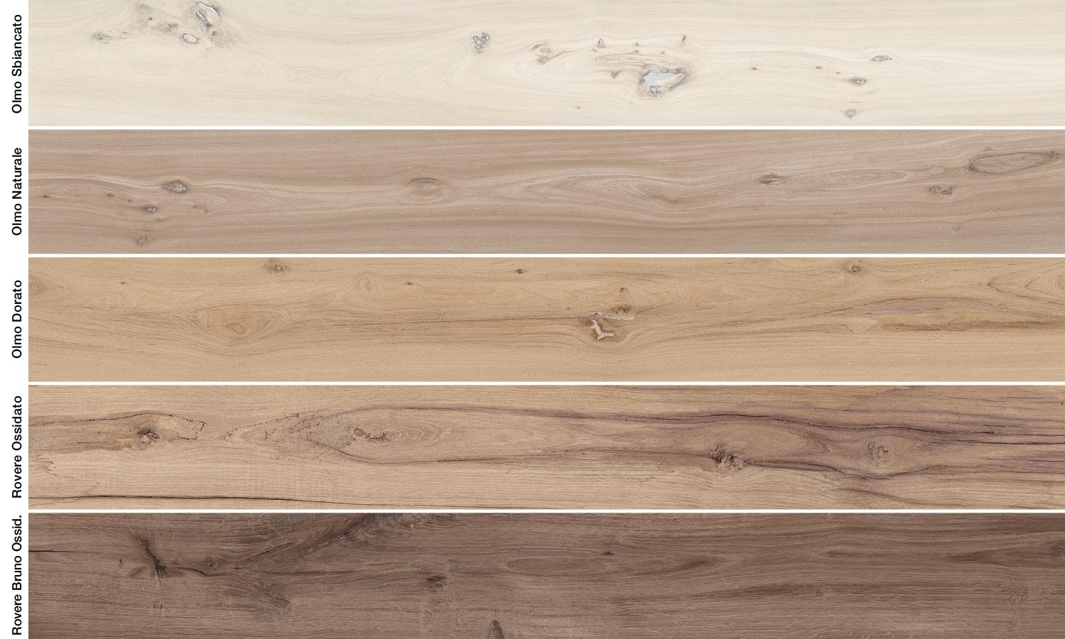 Una gama compuesta por 3 variantes cromáticas de olmos norteamericanos, unas más fieles a la imagen y las sensaciones originarias y otras inspiradas en determinados tipos de tratamiento de las tablas, y dos variantes de preciado roble alpino oxidado, que reproducen el aspecto especialmente característico y pintoresco de esta clase de madera tras un prolongado período en contacto con el agua. Millelegni Remake: una nueva síntesis entre la elegancia espontánea de la madera, las transformaciones de las superficies debidas al paso del tiempo, el toque artesanal de la materia trabajada por el hombre y una avanzada sensibilidad en el diseño. Una colección ideal para proyectar, de acuerdo con un gusto natural y lleno de personalidad, espacios residenciales y comerciales contemporáneos.