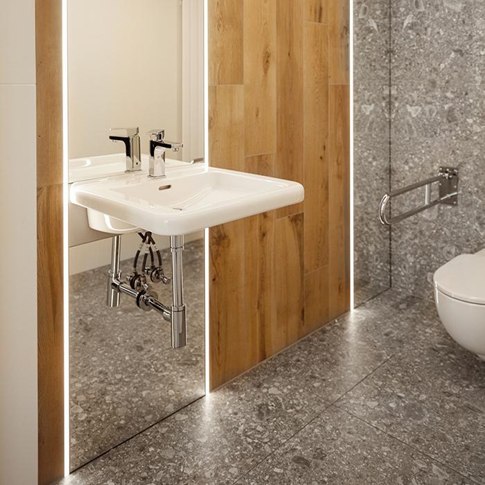 Encontramos Lombarda by Ergon en los pavimentos y revestimientos de la zona principal de la clínica: la recepción, la sala de espera y el aseo. La colección combina un estilo elegante y refinado con un alto rendimiento técnico que la hacen adecuada para un lugar tan delicado como una clínica. Para este proyecto se ha elegido el formato 90x90 en la tonalidad Grigio.