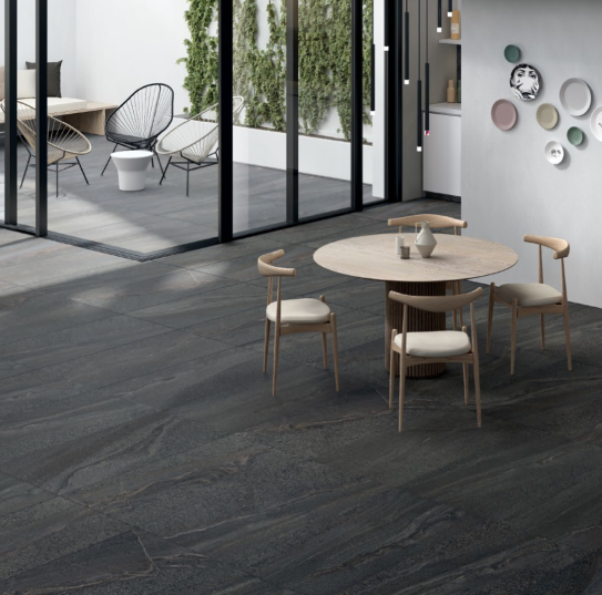 Deux formats rectifiés – 24”x48” et 12”x24” – et un décor traversé d'un élégant relief, se prêtent aux applications coordonnées en sol comme en mur.