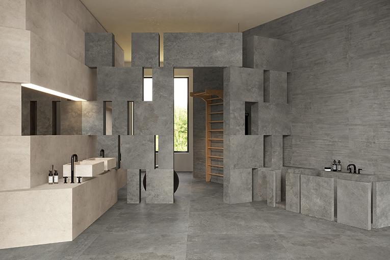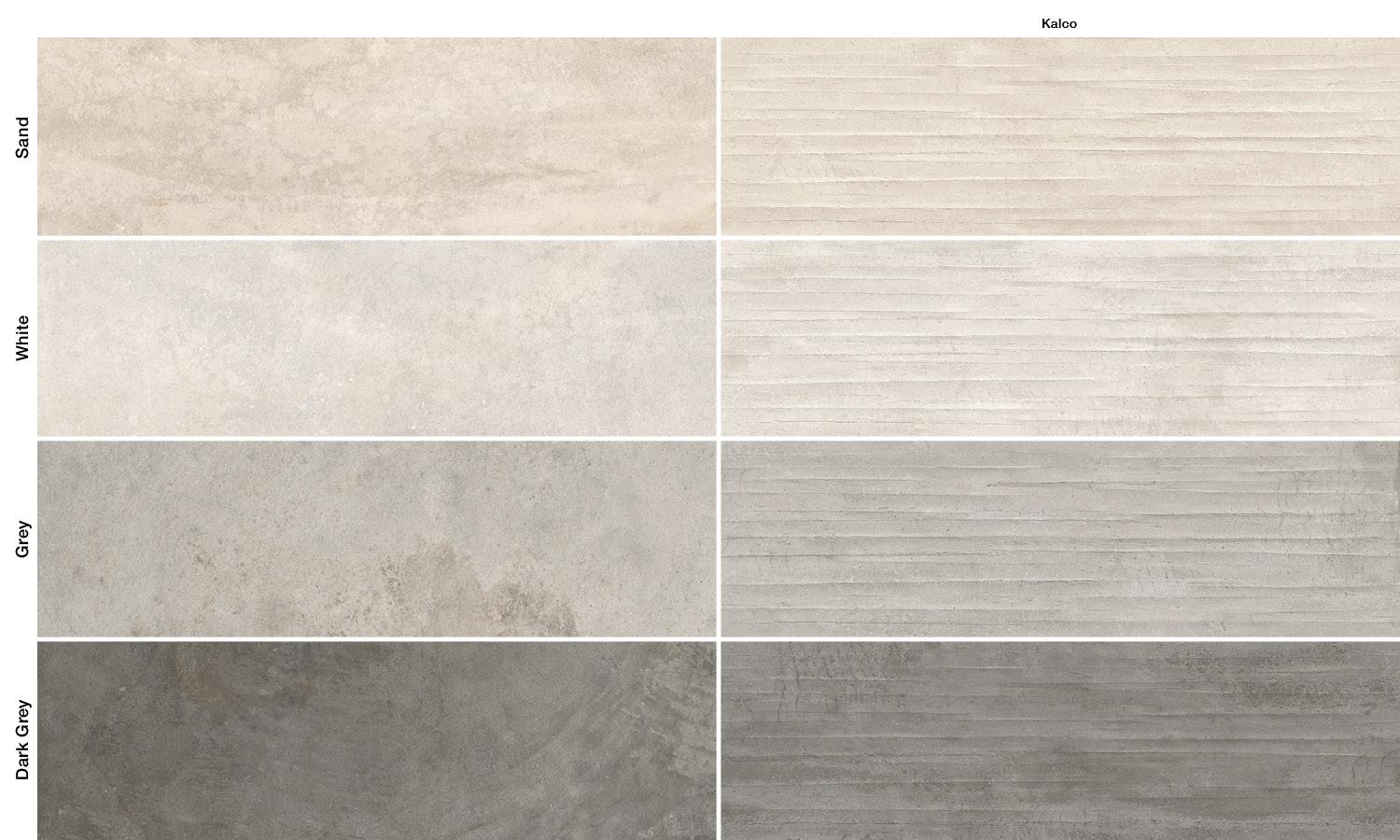 Matière qui progresse, bétons usés, récupérés, qui sont façonnés en faveur du design à l’aide d’un processus de création qui, petit à petit, les purifie et leur apporte raffinement, sans toutefois les priver de leur âme originale vive, authentique et dynamique. Caractérisée par des irrégularités de surface et par les traces du temps, la collection Fabrika se décline en quatre couleurs : White, Sand, Grey et Dark Grey dans les formats 100x100, 60x120 et 60x60. Le format 100x100 est proposé aussi en surface antidérapante « Tecnica ». Pour les espaces extérieurs, la collection comporte également le format 80x80 en épaisseur 20mm. Le décor tridimensionnel Kalco 60x120 offre volume et intensité tactile à la collection : les lignes horizontales se poursuivent en exaltant la nature élégante et raffinée de la surface.