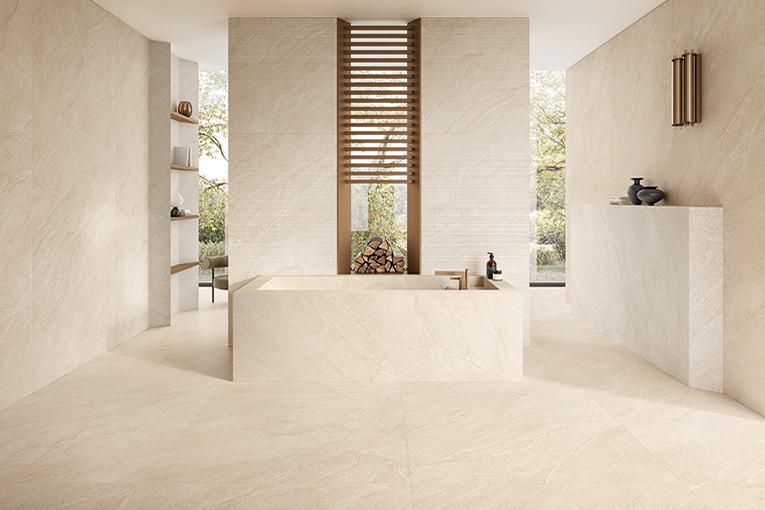 Le résultat : une collection de surfaces céramiques au caractère affirmé, qui associe le raffinement sophistiqué du marbre à l’élégance de la pierre. La texture, riche et profonde, paraît presque vibrer : elle révèle des traces irrégulières et des contrastes subtils, où les veines, jamais identiques, se déploient comme des filaments naturels fluides et mouvants. Pietra di Orosei est pensée pour les espaces contemporains en quête d’un équilibre entre raffinement et authenticité minérale. Le Décor Rilievi introduit une tridimensionnalité forte et expressive: son façonnage atteint jusqu’à 5 mm de profondeur, sculptant des volumes puissants et marqués qui subliment la matière et renforcent l’impact visuel de la surface. Un décor pensé pour créer des murs sculpturaux, où lumière et ombre interagissent pour révéler toute la force minérale de la collection.