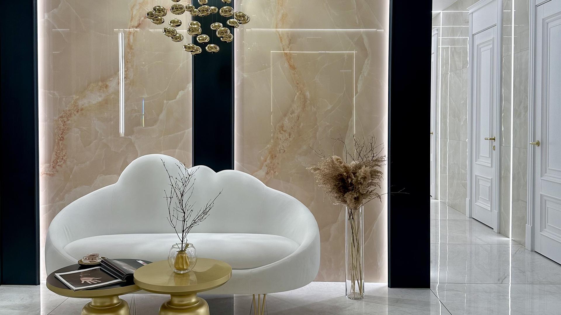 Tele di Marmo Onyx dans les couleurs Rosa et Avorio rappelle l’ambiance du petit matin, de l’aube, du renouveau, du luxe précieux des teintes naturelles. C’est la raison principale pour laquelle j’ai choisi la collection d’Emilceramica.