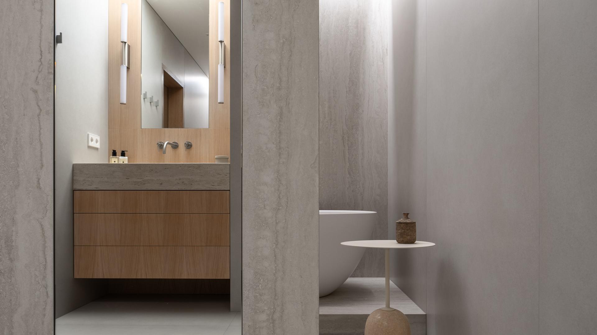 Un des aspects que nous avons le plus apprécié dans ce projet est certainement la composition symétrique de cet espace avec un mur central en finition travertin qui crée un espace ouvert et fluide dans la pièce. Derrière le mur se trouve la baignoire, qui est mise en valeur par son placement sur une plaque en grès cérame et par le fait qu’elle est encadrée par une surface en grès encastrée dans le plafond. Ces détails créent un espace spa séparé des éléments qui composent le reste de la salle de bains. De plus, la douche ouverte et indépendante amplifie la sensation d’espace.
