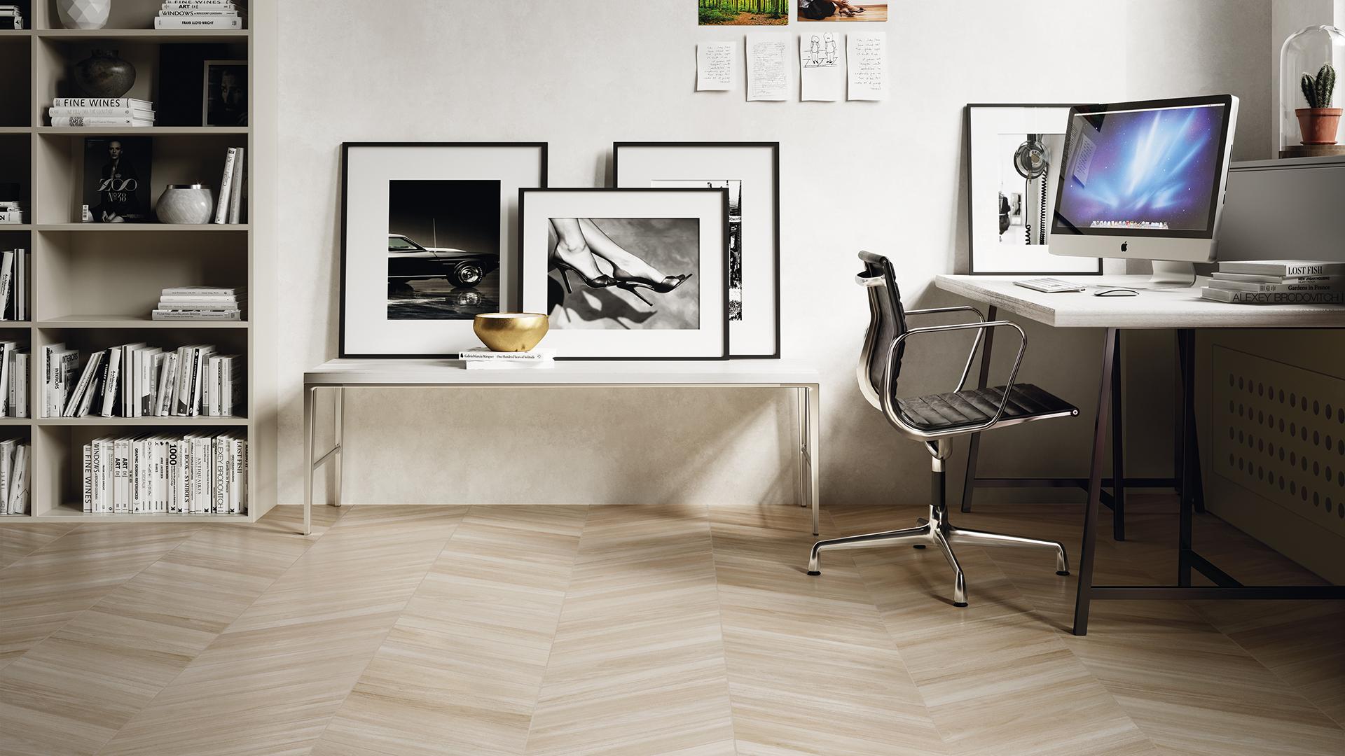 It is essential to choose the right color for our workspace. But before evaluating various possible shades it is important to decide which space in the home we are going to convert into an office. Some of us are able to create a new space from scratch in a room we do not use much - like a guest room, for example - while others are more limited in their options and have to make use of a room already used for other purposes, the living room for example, seeking to carve out a quiet little niche where they can concentrate during the working day. For this reason the colors of home office flooring or walls must be chosen with particular care, even if this might seem difficult at first. We believe that the best flooring for home offices consists of pale-colored tiles, particularly in spaces that are heavily shared over the course of the day, like the bedroom or living room: light shades make the room more welcoming, comfortable and airy. At the most frenetic and busy times of day, being surrounded by an environment with relaxing colors also makes it easier to overcome the inevitable moments of stress. However, there is no doubt that your personality also plays an important role: if a warmer environment makes you feel good then dark shades can also be an ideal solution, perhaps eventually prioritizing glossy finishes which make the space attractive without being oppressive. Having chosen the colors it is time to evaluate a few ideas for the home office floor based on your preferred materials or the style you want to achieve.