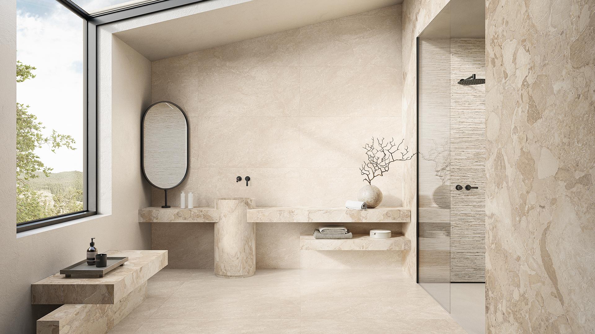 In a small bathroom, the use of light-coloured, large-format tiles helps to visually enlarge the space, creating an effect of continuity that improves visual perception. The creation of smooth, uniform surfaces in light shades promotes a sense of airiness, increasing the size of the room, especially when accompanied by mirrors and reflective surfaces. For example, Matera Stone by Ergon represents innovation and design, reinterpreting raw stone with a touch of refinement. The light colours of this collection are ideal for shower wall coverings, creating positive energy and mental well-being.