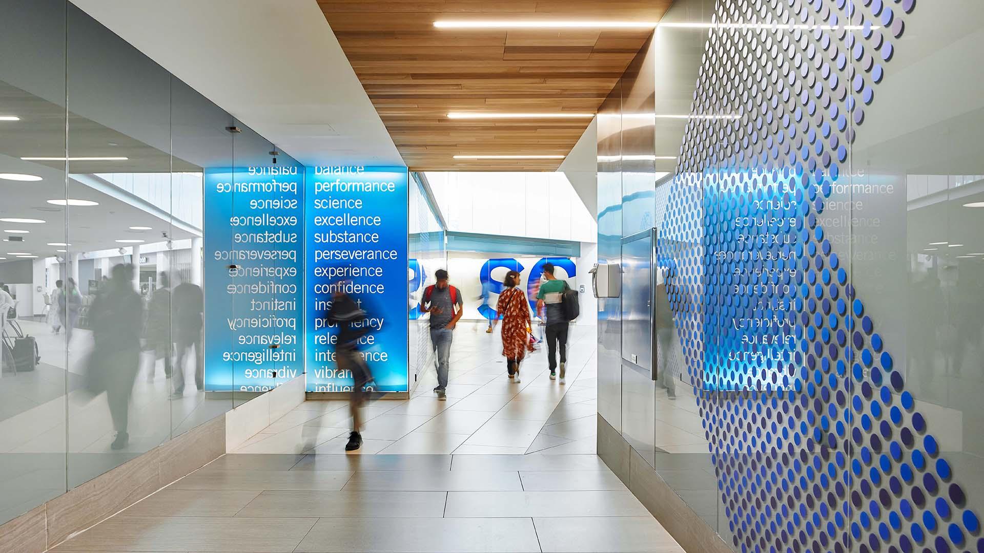 We selected Stone Project by Ergon for its high quality and format that helps to bring order to a large, open space. The linear porcelain tiles were installed in grey and white as subtle wayfinding – creating a pathway that helps direct crowds through the Student Commons. Alternating tones of porcelain floor tile demarcate different activity zones, such as the corridor, event space, food hall, and gathering space while darker grey tiles define seating areas.