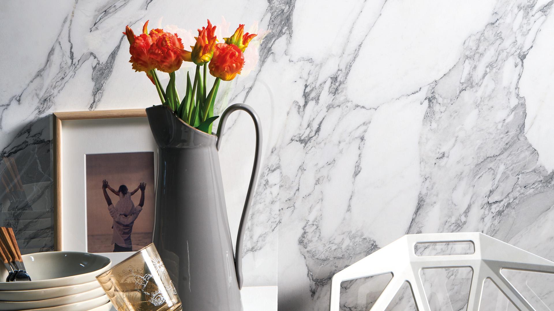 How do I clean glazed porcelain stoneware? Using the right methods, it is easy and convenient. To keep the beauty and shine of the tile intact, it’s best to start taking care of it immediately after installation: washing the work site is a fundamental step for removing the installation residue and dirt. Glazed stoneware gives life to a bright and non-porous surface, upon which dust and residue can easily appear – it’s important to carefully remove it before washing. After cleaning, a few bothersome enemies may appear on glossy surfaces: therefore here is how to remove stains from porcelain stoneware tiles. Just use neutral cleaning solutions diluted as much as possible, being careful to avoid using products that contain polishes or waxy substances. Sponges and abrasive pads must also be avoided in maintaining glazed stoneware floors. After being reassured about the ease of cleaning, we can choose the best marble effect glazed tile. And for large projects, Level Marmi has an unbeatable range of colors. More than 40 tiles to explore the evocative and architectural potential of the most noble and sophisticated material. Every vein pattern, reflection and stratification is enhanced in the details and in the proportions: the slabs (160x320, thickness 6.5 mm rectified, and 162x324, thickness 12 mm unrectified) turn every tile into a work of art.