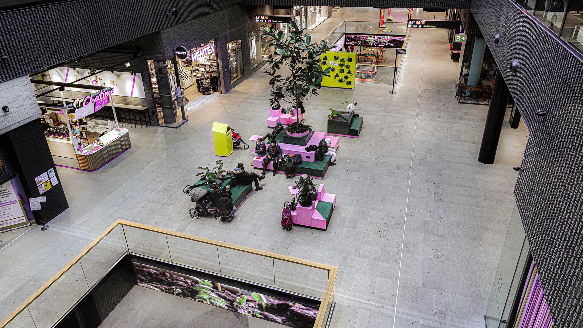 The shopping centre has three floors, each with its own shade of tiles, which helps visitors to find their way around. The floor design changes from a darker shade on the lower floor to a lighter shade on the higher floors.