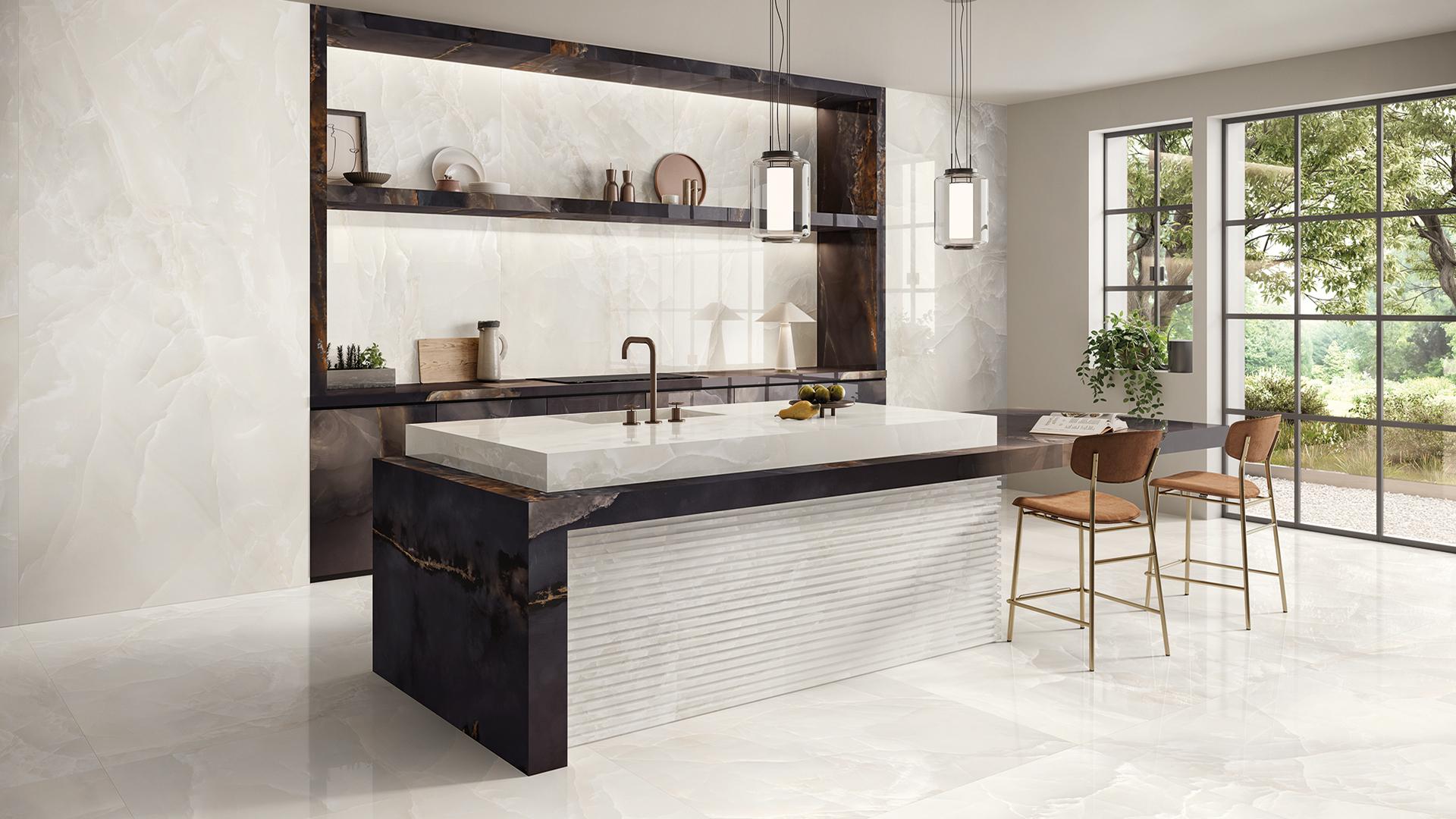 The kitchen backsplash, as well as protecting against splashes, naturally, is also the element which visually joins the kitchen countertops and appliances to the cabinetry. When choosing these particular (and strategic) tiles, it is advisable to take into consideration the combination with the other elements of the kitchen – an environment which lends itself to more experimentation than other rooms in the house, a touch of eclecticism, a break from the principle of continuity which guides the esthetic choices of walls and floors. Marble is often the winning solution for connecting the backsplash with the kitchen cabinetry, without ever being banal or lacking in harmony. The kitchen is the ideal place to bring the timeless appeal of marble together with the tastes and perceptions of more contemporary design. Tele di Marmo Onyx by Emilceramica is an ideal starting point to realize this new way of thinking of marble. The collection takes an original look at one of the most appealing materials – the fruit of scrupulous study of the patterns and veining in some of the most popular marbles in the world, with iconic and vibrant colors. The tribute to the ancient perceptions of onyx gives new life to a tile which is almost a work of art: the richness of the vibrantly bright facets and the chiaroscuro effects come to life in five refined color variants. The possibilities of marble expand to reach new surfaces which combine its timeless appeal with the most refined contemporary design taste.