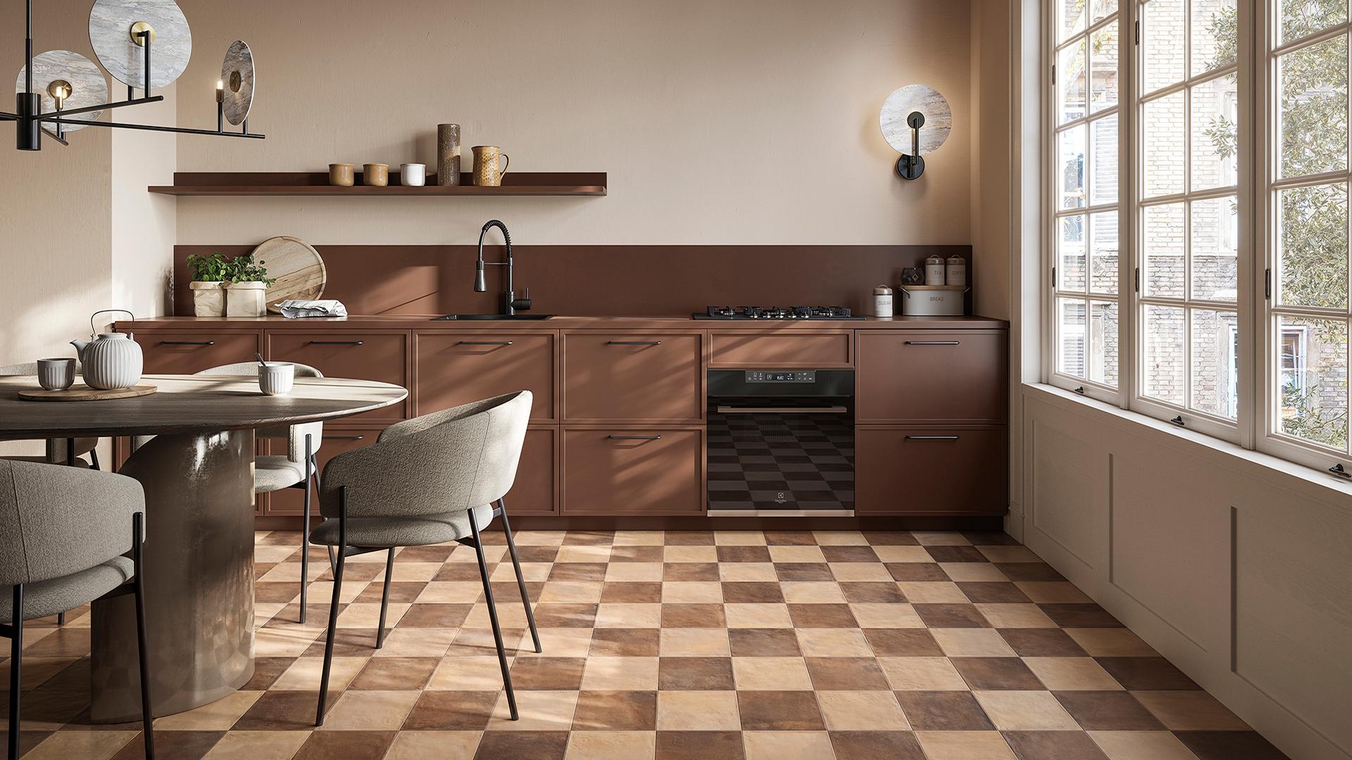 A striking option is the Abacus by Ergon collection, which reinterprets the classic 7.5x20 cm brick format with vibrant shades such as Senape, Cipria, Petrolio, Amaranto and Lavanda. Available in both matte and glossy finishes, this collection is inspired by Mediterranean ceramic traditions, adding depth and brightness to the kitchen. The Plissé decoration, with its three-dimensional texture, further enhances the visual effect.