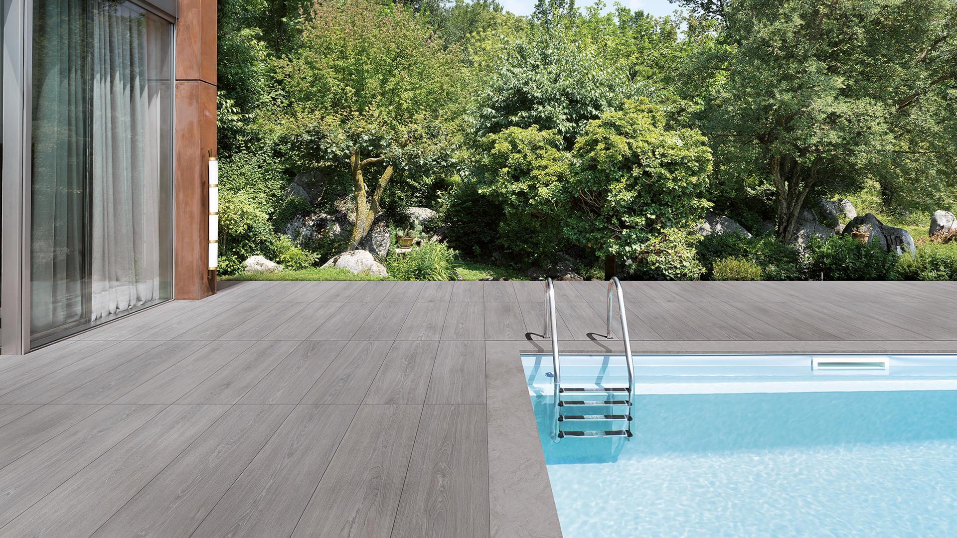 In order to orient yourself in the choice of the most suitable tiles for swimming pools, you should take into consideration the surrounding space. An effective dialog between the tiles and the surrounding environment (or between the inside and the outside) is a highly appealing element, with a high-design value. Think about a swimming pool covered in stone incorporated in a sleek and minimalist design space, or the environmental beauty of a wooden pathway through a flourishing garden. The possibilities offered by porcelain stoneware make the most of any environment and satisfy any design requirement.