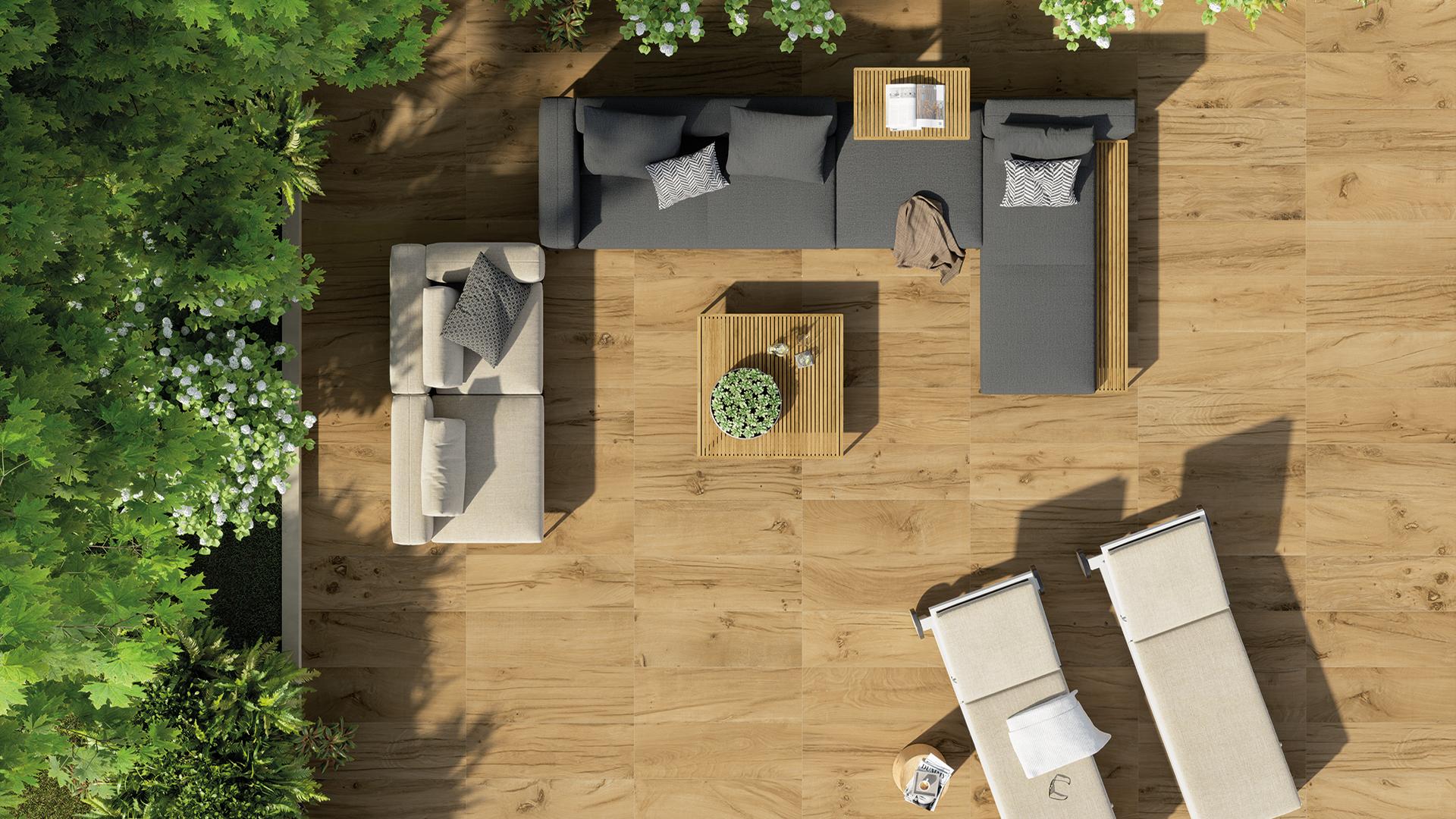 The trend that is pushing more and more people to try to project their dwellings toward outdoor spaces will continue in 2023, by preparing terraces and yards rich in elegant design choices. These places, apart from becoming true architectural elements that embellish the buildings, reflect the owner’s taste by creating a connection with the surrounding environment through a natural design that communicates directly with the surfaces. The coverings thus take on shades that are reminiscent of grass or the countryside - green floor tiles in a wide variety of tones become the starting point for wide open terraces that are full of light. Tiles in nuances such as Sabbia, Salvia or Fango (sand, sage green or mud) from the Sixty by Emilceramica collection are perfect examples of expressive possibilities to open up to the outdoors. Otherwise, to continue the dialog with the outdoors, the natural effect of reclaimed wood from Revival by Provenza can be used: a collection where the recycling of a noble material becomes the protagonist by taking the central role from the green of nature. Balconies and terraces become like windows facing nature, a breath of fresh air that is within reach, even in apartments in the middle of a city. Green coverings or those that evoke the environmental influences of wood are the ideal base for relaxing spots to enjoy the sunlight on a Sunday afternoon or to watch the city lights turn on. If the tiles - like those of Sixty by Emilceramica and Revival by Provenza - have ribs that augment the feel below your feet, then it seems like you have a piece of nature all to yourself.